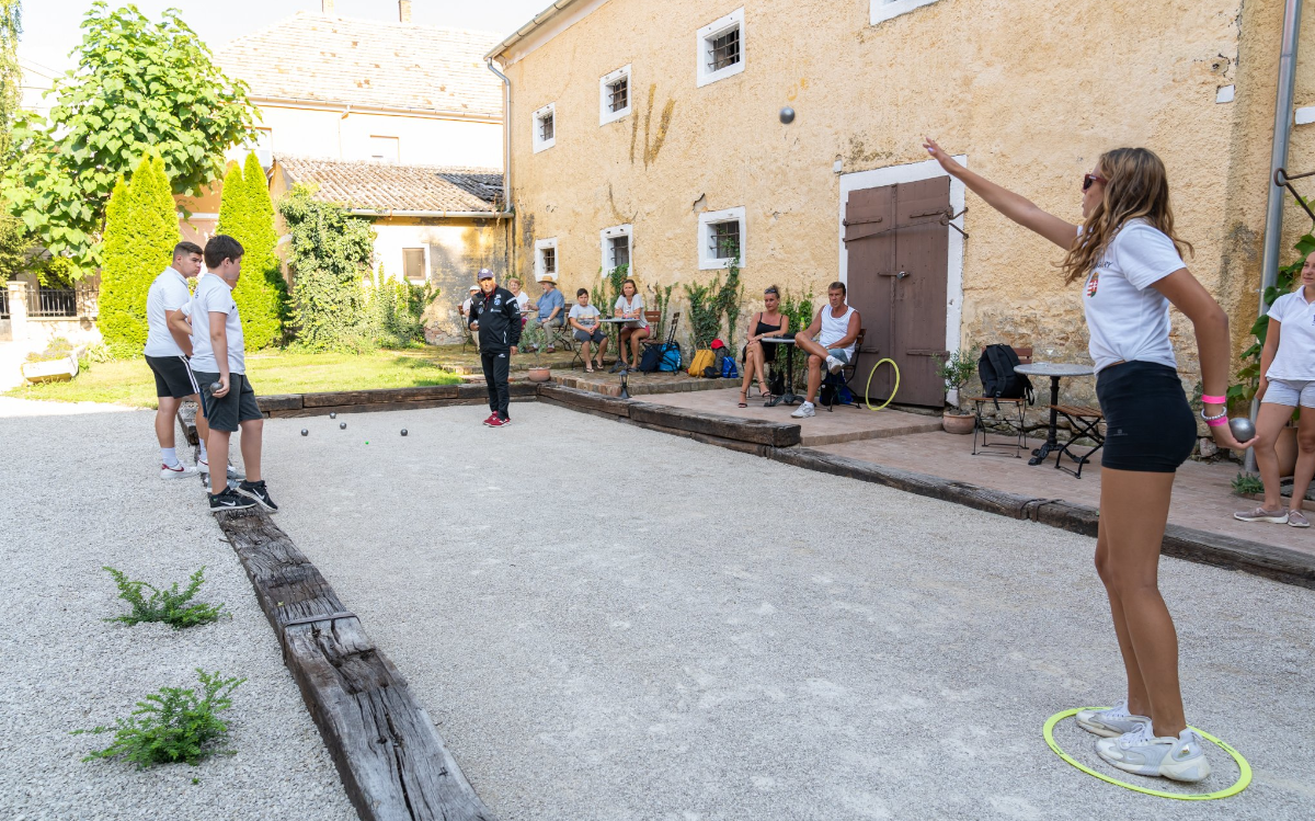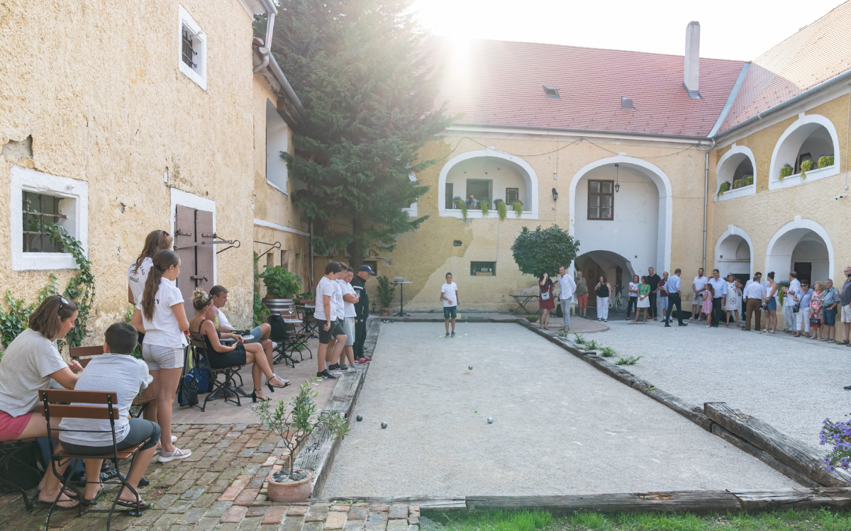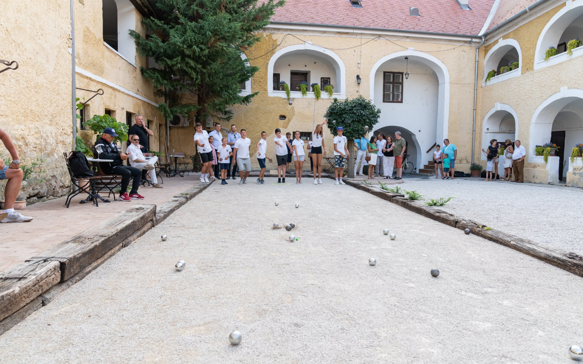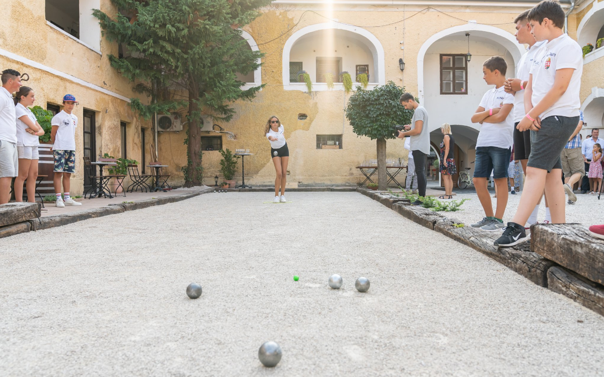 The Petanque court is located in one of the most atmospheric enclosed courtyards in Keszthely. It is the perfect setting for such a game, as it is close to Keszthely’s bustling main street, yet still provides a peaceful and undisturbed environment for playing. The entrance to the courtyard is from the Promenade Street, and the pitch is surrounded by buildings of historical and art-historical significance: Keszthely’s oldest civilian building, the Pethő-house, and the old-fashioned synagogue located at the back of the courtyard.