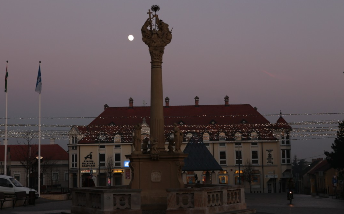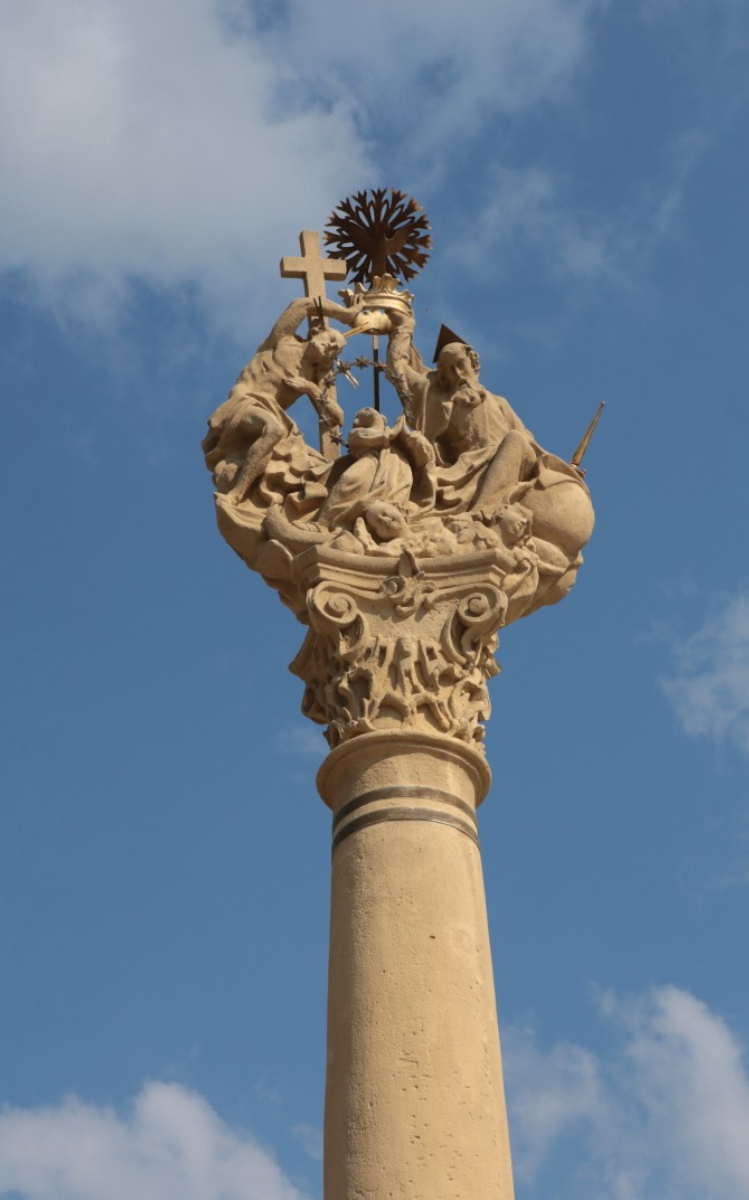 In the western part of the Main Square is located the oldest public artwork of the city center, the Baroque style Trinity Statue erected by Pál Festetics in 1770. Upon closer inspection, we can discover the statues of Saint Florian, Saint Sebastian and Saint Roch, and a small angel on the triangular pedestal. From here rises the high Corinthian column, on the top of which the Trinity statue group is visible.