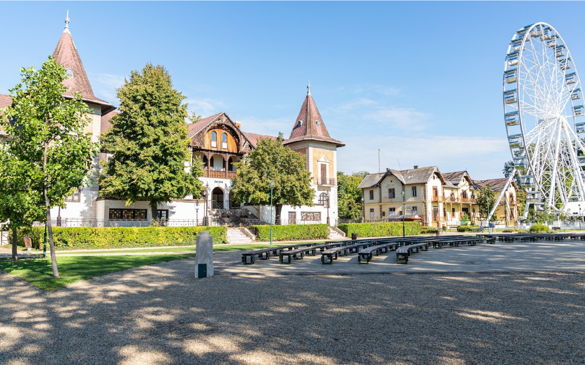 The Balaton Hotel was opened in 1895. After 1954 it became a company resort, but its condition gradually deteriorated and a fire in 2008 destroyed its roof structure. To this day it is awaiting renovation. From spring to autumn, the Giant Wheel of Keszthely stands in the square in front of the hotel.