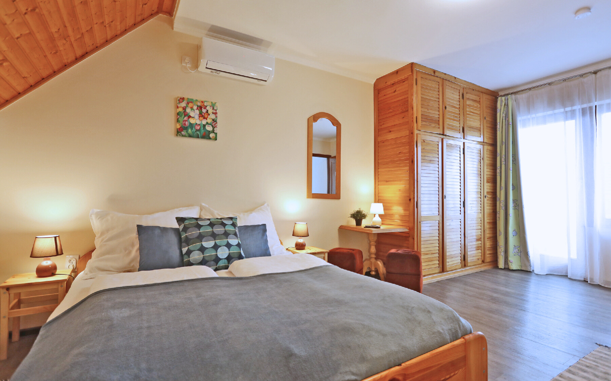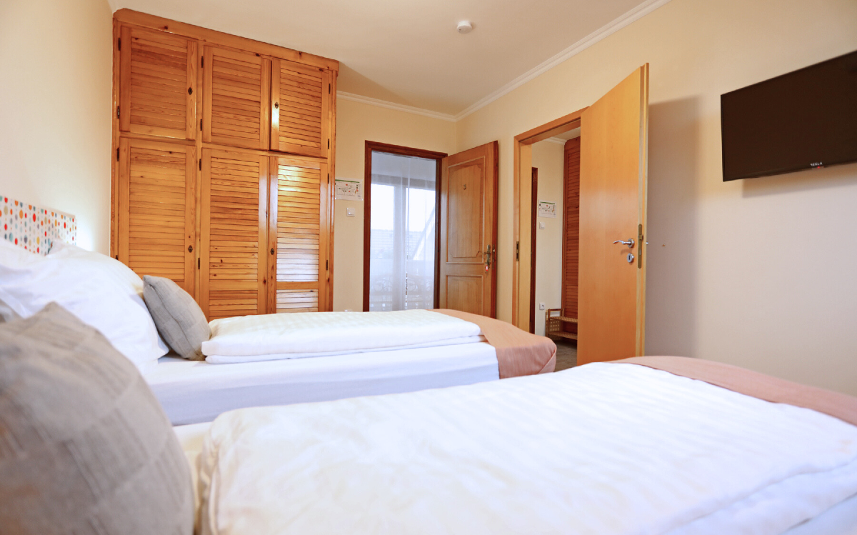 The infrastructure in the area is excellent, many shops and services can be easily and quickly reached on foot. The nearest beach, the shady and homely Libás (Goose) Beach is a fifteen minute comfortable walk away. From spring to autumn, the guest house can accommodate a total of sixteen guests and four to five dogs (of any size) on three floors.