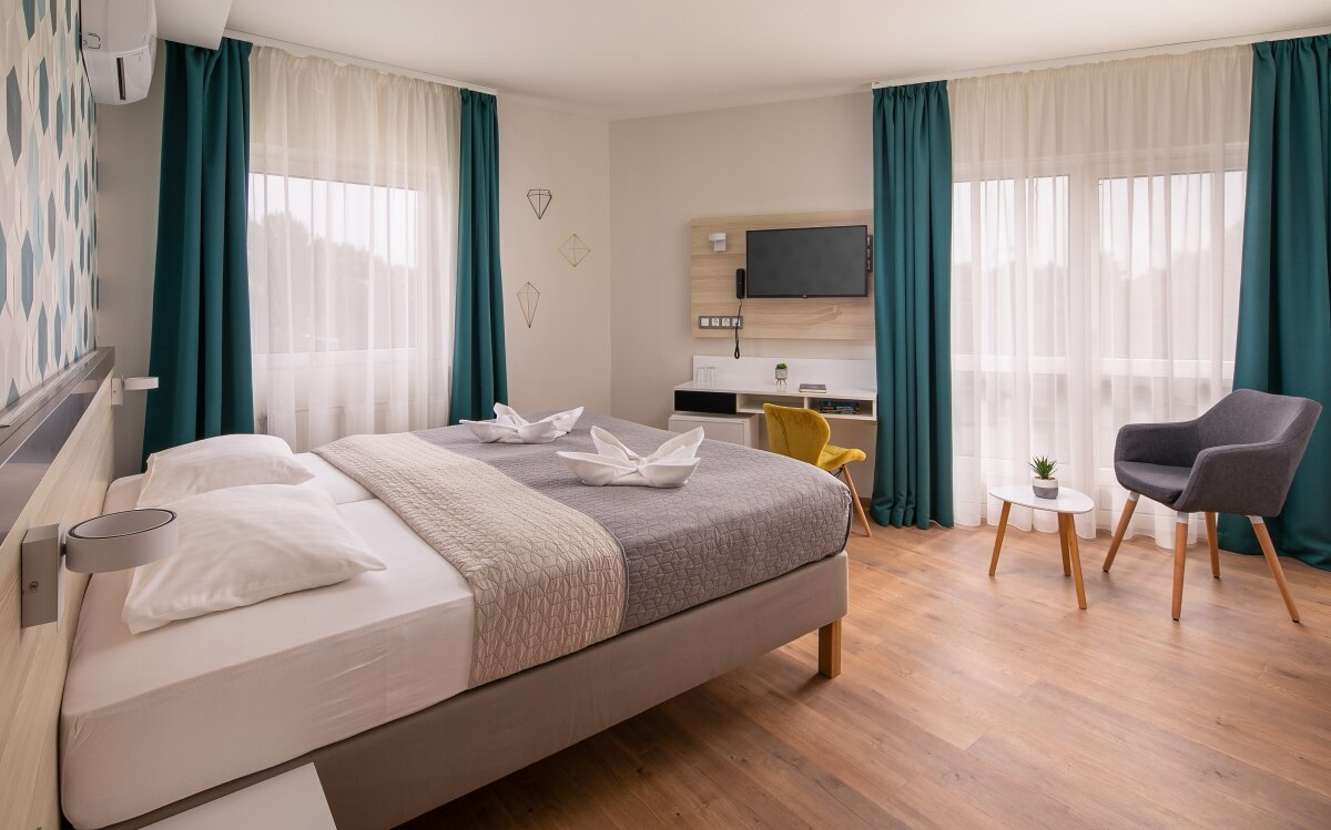 Most of the 40 double deluxe rooms have balconies with views of the surrounding green areas. The wellness section includes dry and infrared saunas, steam baths, salt chambers and a Jacuzzi.