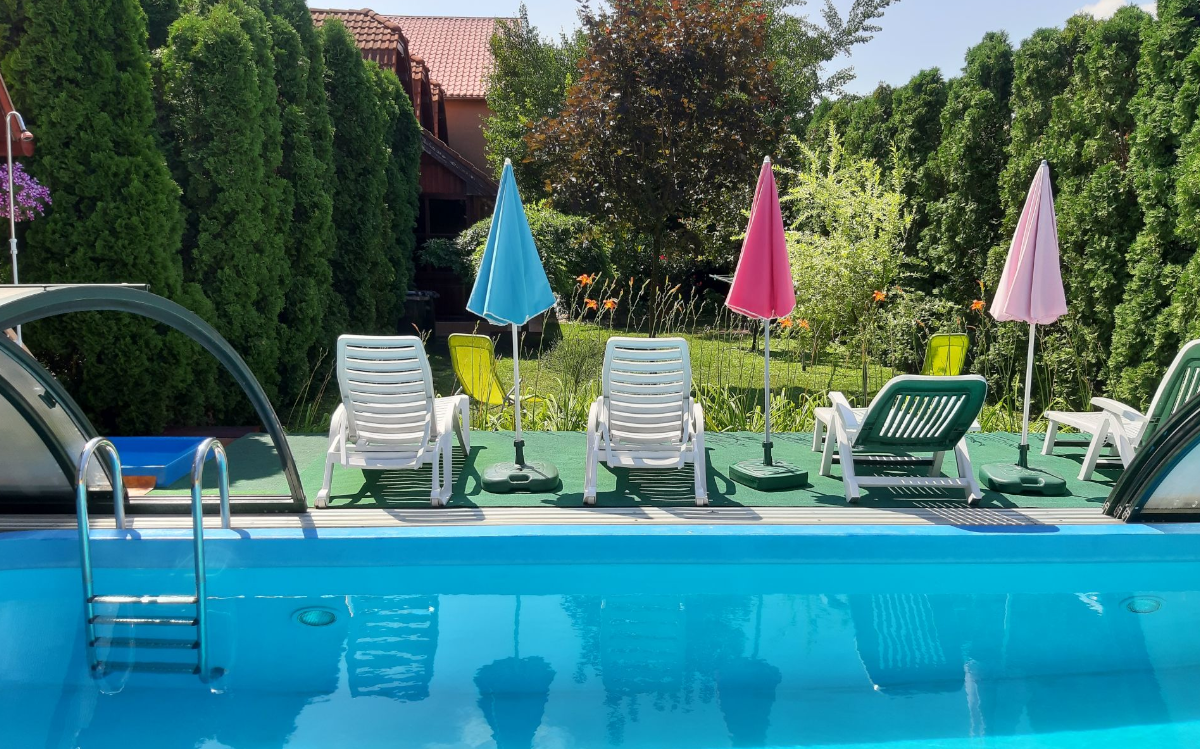 A retractable roof free-to-use swimming pool (8*3.6 meters) in the garden provides pleasant relaxation, surrounded by garden furniture, a shower terrace, sunbeds, and a clothes dryer.